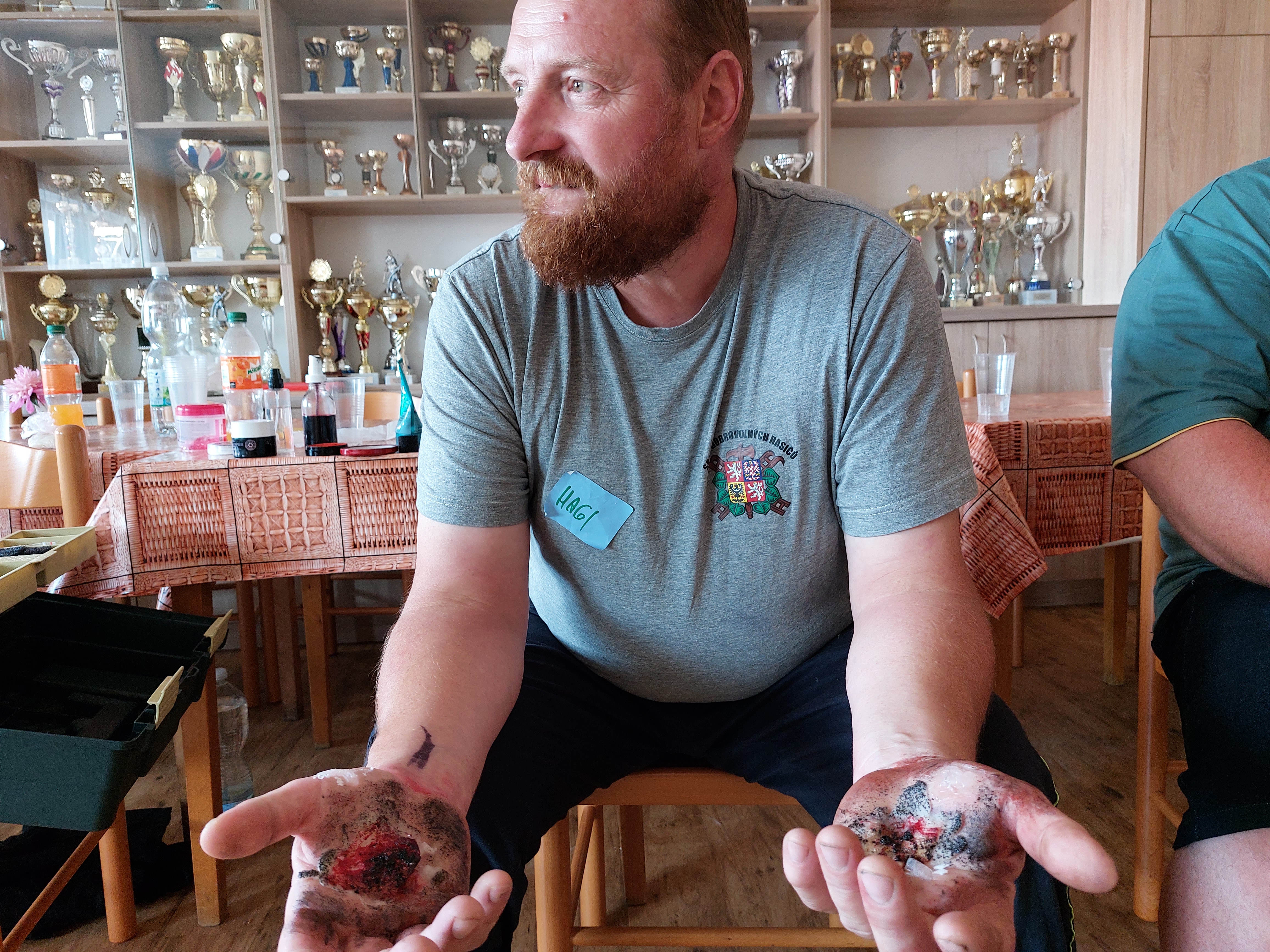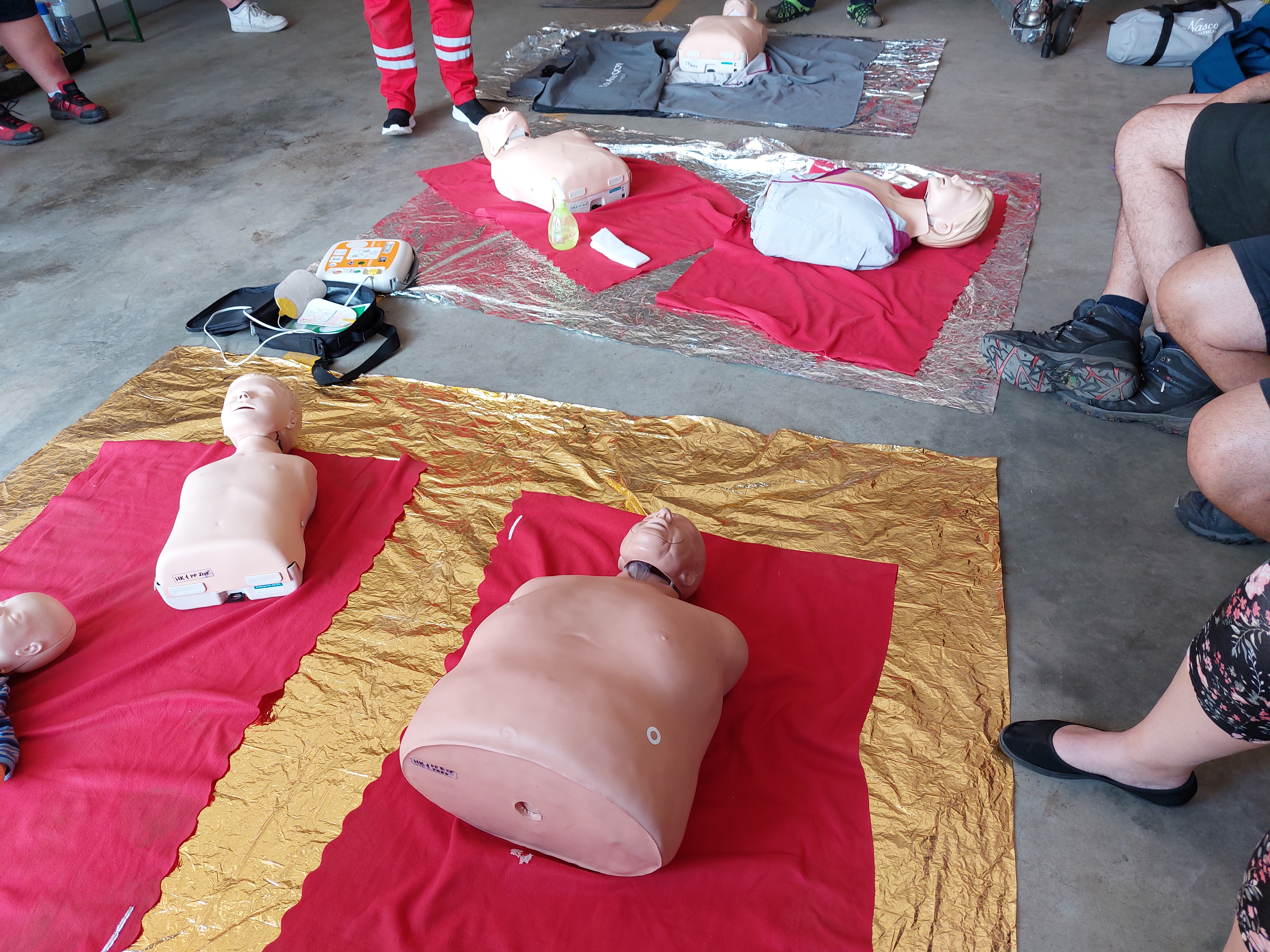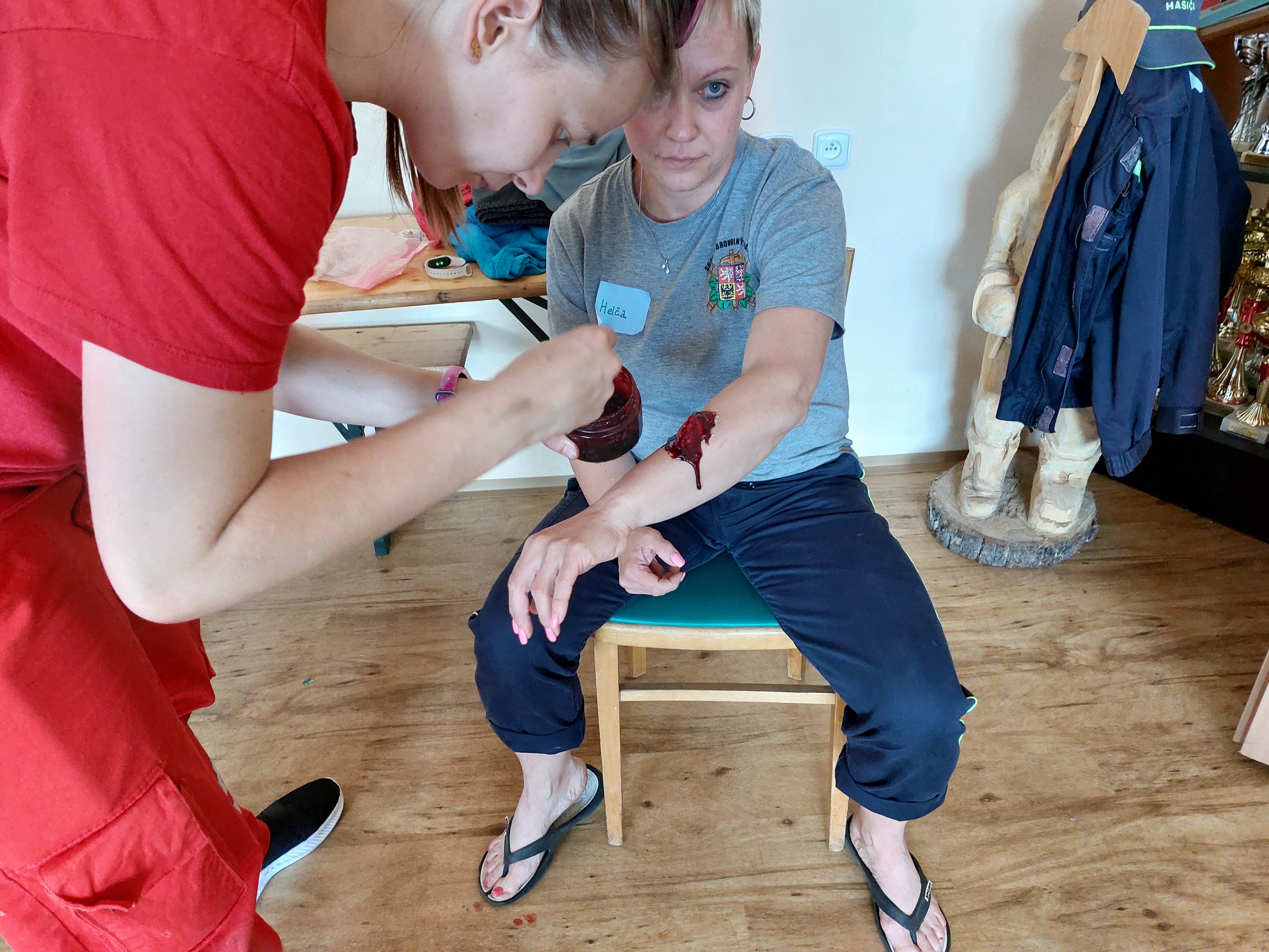 Školení začalo v 8:00 seznámením s lektory a rozdělením do dvou skupin. Během školení se probírala teorie, která byla okořeněna náhodnými nečekanými událostmi ze strany lektorů. Náhlý kolaps nebo pořezání o nůž zpestřilo teoretickou část. Po obědě jsme pak zužitkovali nabyté vědomosti v praxi při simulačních událostech, jako nehoda automobilu nebo popáleniny v kuchyni.